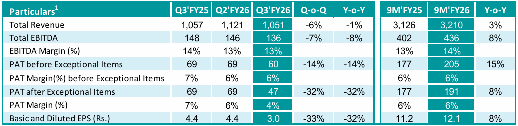 This quarter presented its challenges, with softer pricing across all three segments. However, strong volume growth helped offset this impact, resulting in overall business performance remaining stable. EBITDA % was maintained at 13% same as Q2. Over the nine month period, our volume grew in double digits, leading to revenues increasing by 3%, EBITDA rising by 8%, and even after accounting for the amendment to the Indian Labor Code and the associated one- time exceptional expense, our Profit After Tax registering an 8% growth.