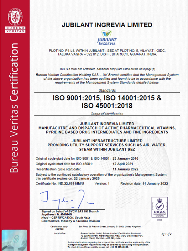The Quality management systems are in line with different applicable ISO standards such as ISO 9001, Food and Feed Safety System Certifications viz. FAMI QS, FSSC 22000 for the various products manufactured at the sites. We comply with Indian drug regulatory/WHO GMP requirements for the sites involved in manufacturing Pharmaceutical actives and Pharma intermediates.