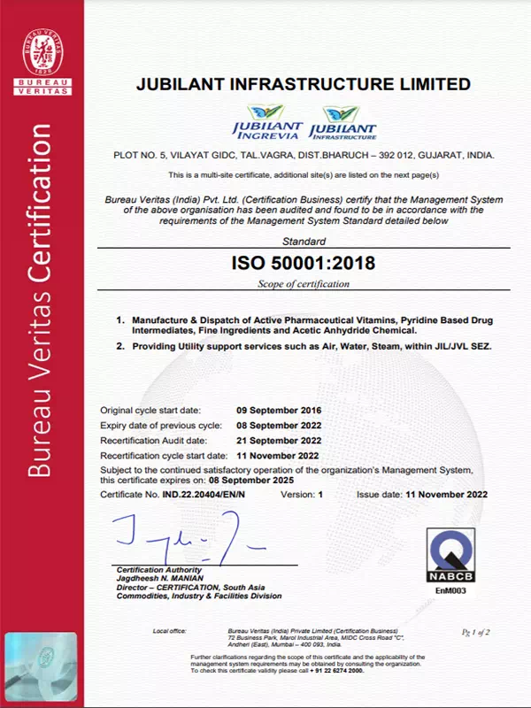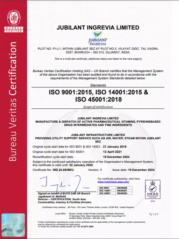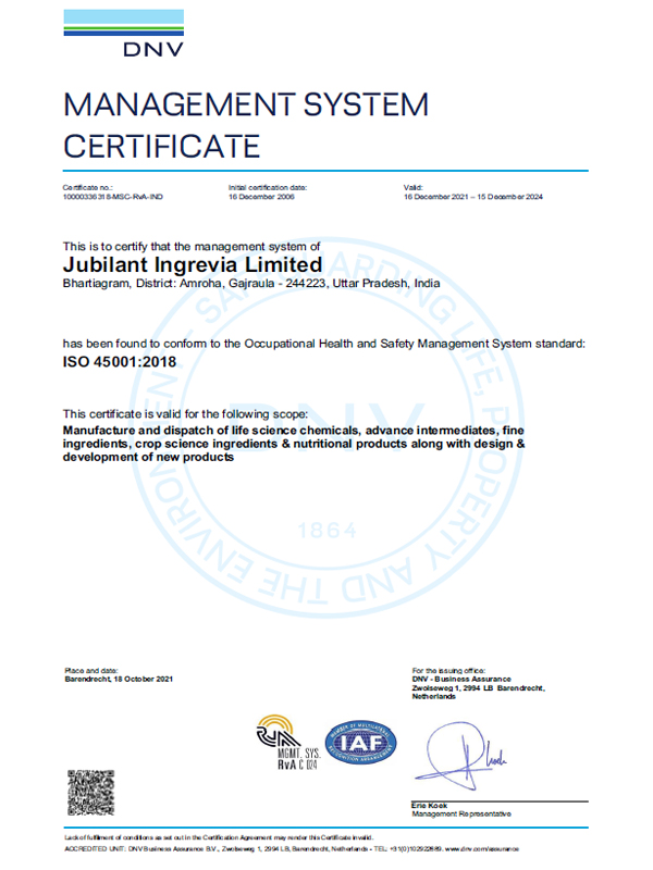 Jubilant Ingrevia Limited is committed to fulfilling the need and expectations of its customers by providing quality products and services. Jubilant operates a well-defined Quality Management systems complying with all applicable national and international standards and regulations. Well-defined processes and procedures are established covering all aspects of the entire value chain.
