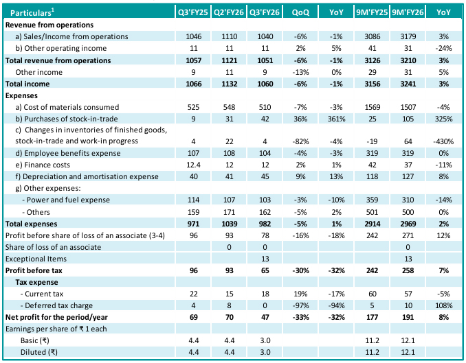 This quarter presented its challenges, with softer pricing across all three segments. However, strong volume growth helped offset this impact, resulting in overall business performance remaining stable. EBITDA % was maintained at 13% same as Q2. Over the nine month period, our volume grew in double digits, leading to revenues increasing by 3%, EBITDA rising by 8%, and even after accounting for the amendment to the Indian Labor Code and the associated one- time exceptional expense, our Profit After Tax registering an 8% growth.